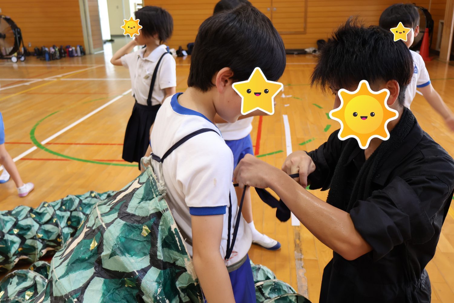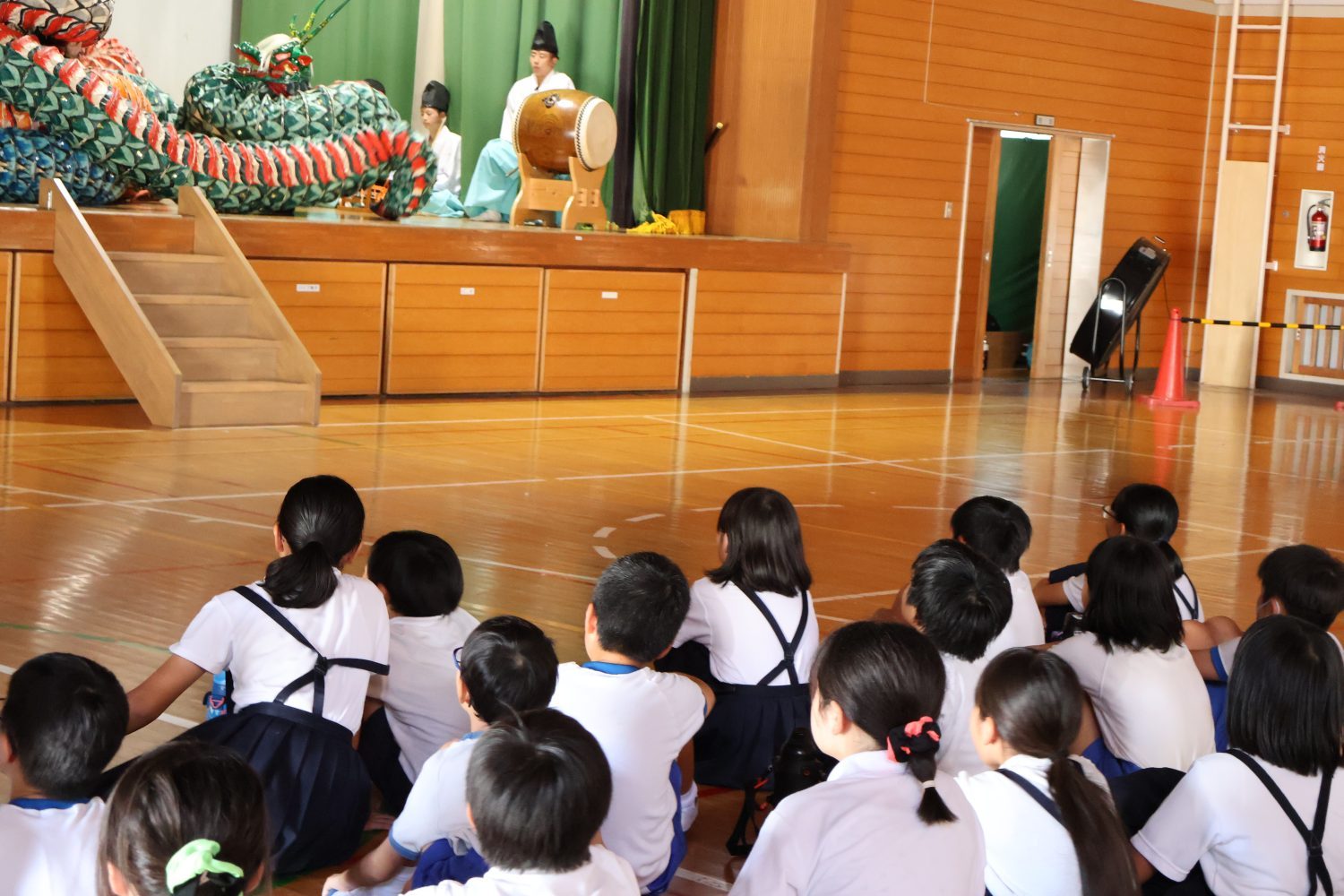 公演後は、三階小学校の児童さんに太鼓をたたいてもらったり、蛇胴や蛇頭をつける体験をしてもらったりしました。うれしそうな顔をしてくれる児童さんに、生徒は大満足でした。