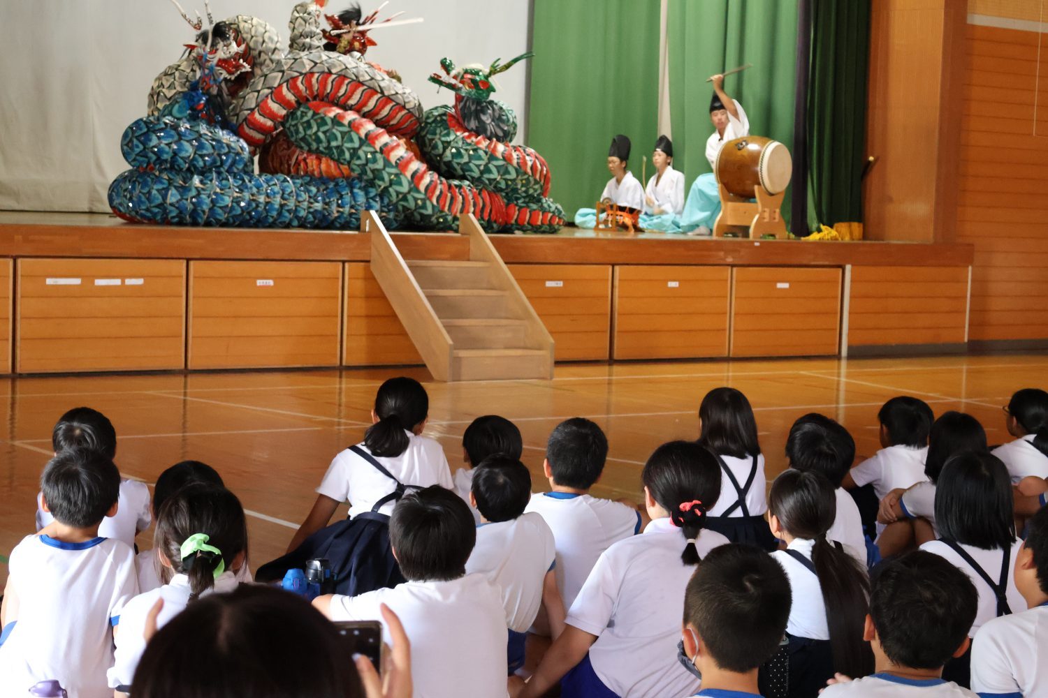 貢献を本校で育てたい資質能力の一つにあげている浜田養護学校ですが、先日、郷土の伝統文化を学習している三階小学校3・4年生から神楽の公演の依頼があり、三階小学校の体育館で「大蛇」を舞わせていただきました。三階小学校の児童の皆さんが、スサノオが大蛇を倒すたびに、大きな拍手をしてくれたので、いつも以上に気合の入った演技ができたようです。